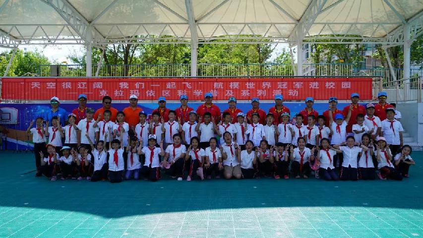随后的表演主持人邀请学生来共同参与,一下子围过来十几个孩子,争着自报家门,站到了即将表演的世界冠军李士其和张兆年身后,迫不及待地想让冠军们带着一起飞翔。主持人请全校师生一起发出起飞的“倒计时”,5、4、3、2、1、发射!两架遥控火箭助推滑翔机模型一前一后发射升空,画出的烟雾和孩子们的欢呼声久久不散。几个孩子在冠军们手把手的教学下操纵着航模飞机,直到飞机落地后,脸上还挂着兴奋和紧张的神情,双眸中闪现的惊奇的眼神。 表演结束后各班孩子们争着和航模冠军们合影留念,欢乐荡漾在克拉玛依第八小学的整个校园里。
